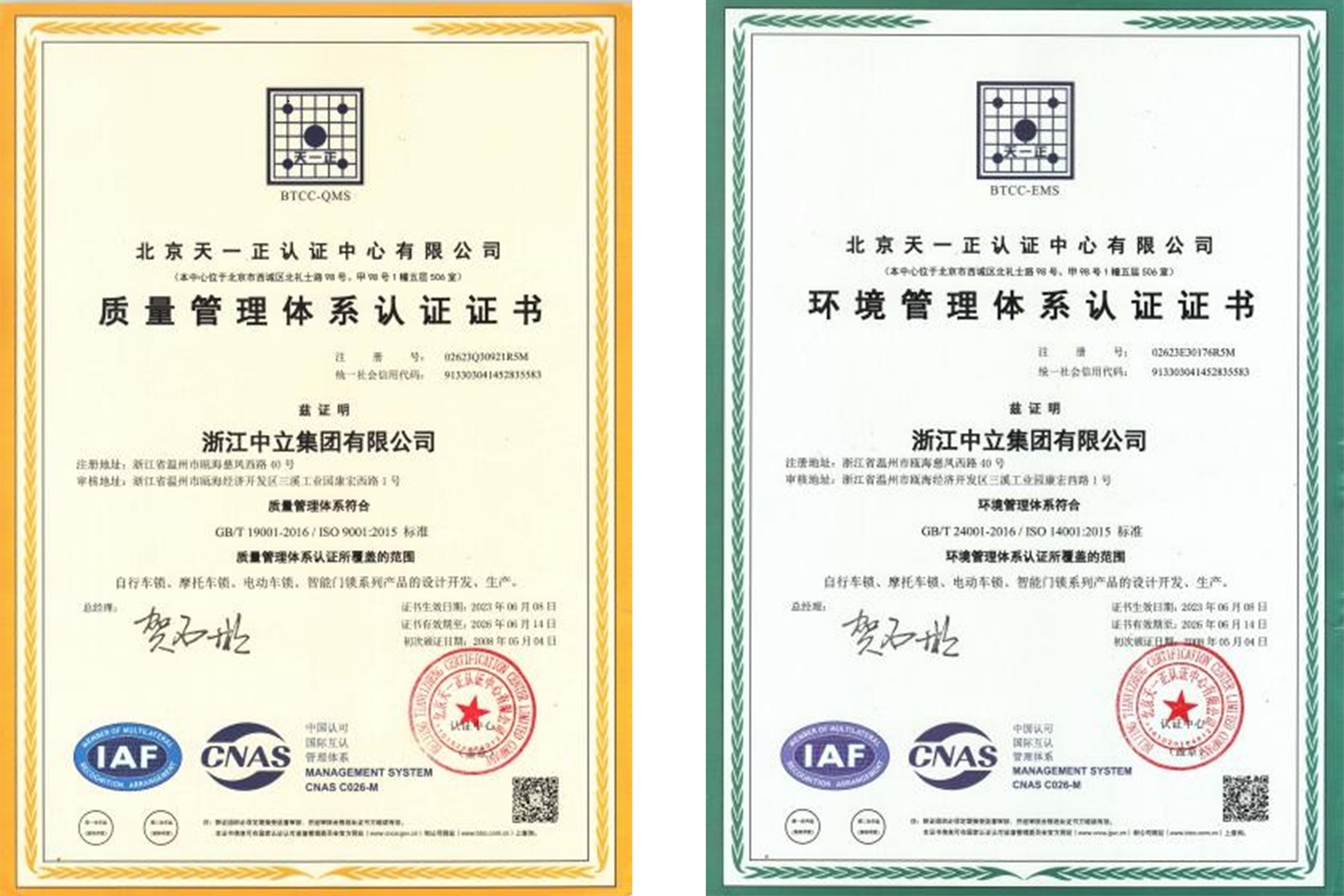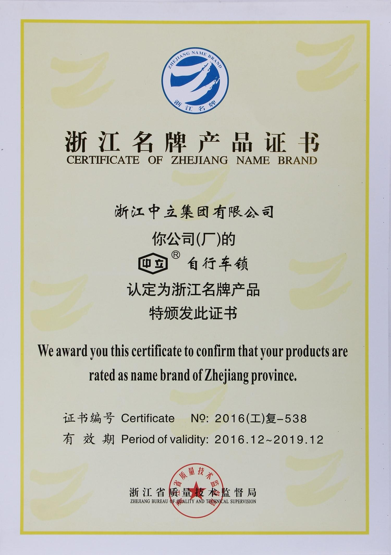 公司是中國十大鎖王,中國自行車鎖具中心,全國五金制品行業(yè)優(yōu)秀企業(yè)公司。中立集團(tuán)檢測中心通過中國合格評定國家認(rèn)可委員會(CNAS)認(rèn)可。公司已獲得二百多項專利授權(quán),主導(dǎo)產(chǎn)品為浙江名牌產(chǎn)品,“中立”商標(biāo)為浙江著名商標(biāo)。設(shè)有浙江省博士后工作站;獲甌海區(qū)政府質(zhì)量獎。已通過 ISO 9001 質(zhì)量管理體系認(rèn)證、ISO 14001 環(huán)境管理體系認(rèn)證和 ISO 45001 職業(yè)健康安全管理體系認(rèn)證。并建立了社會責(zé)任體系,接受 BSCI 審核。