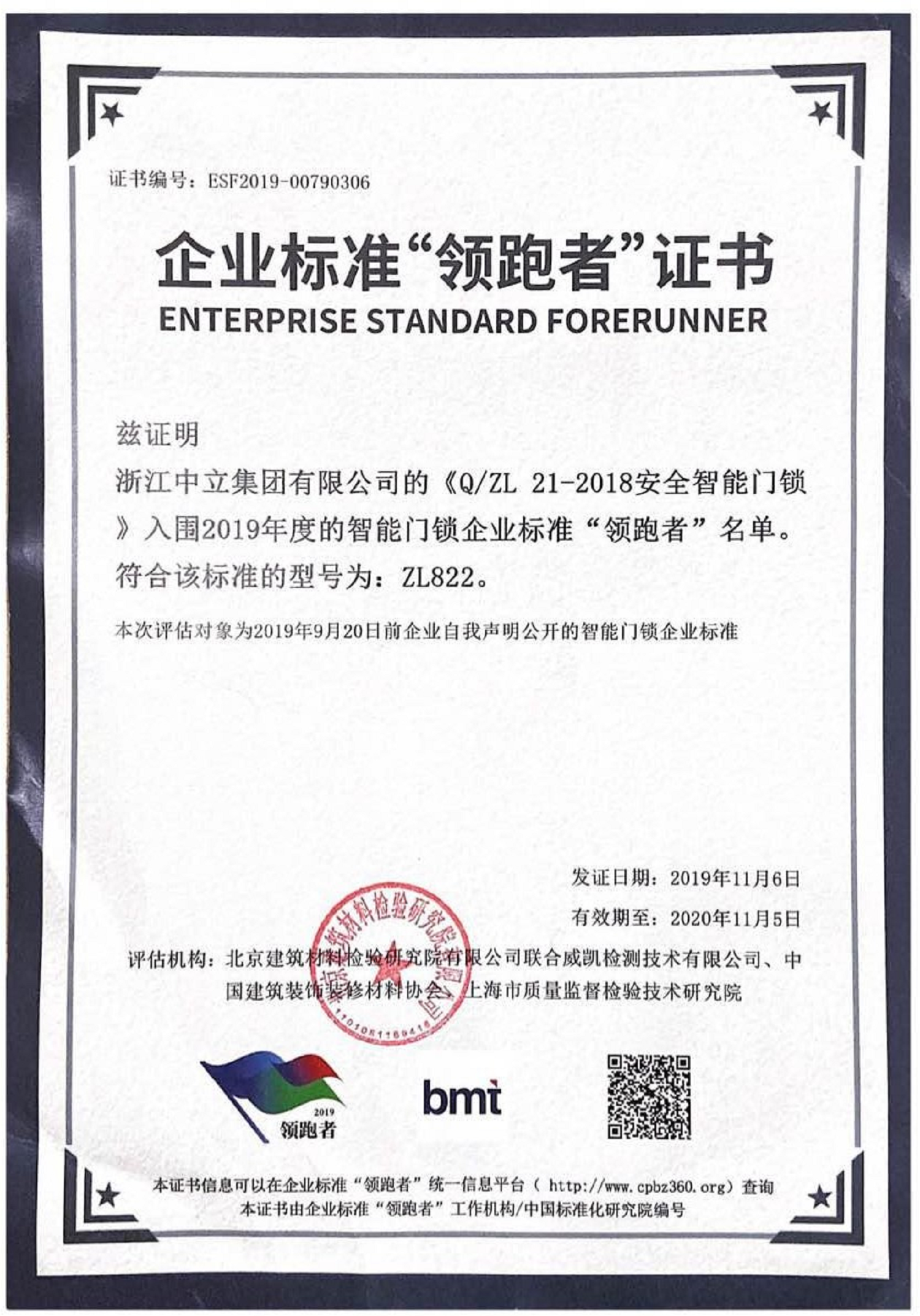 《鎖具 術(shù)語》、GB/T 37634—2019《鎖具 測試方法》起草單位,輕工行業(yè)標(biāo)準(zhǔn) QB/T 1001—2006(2014)《自行車鎖》、QB/T 2473—2017《外裝門鎖》、QB/T 2474—2017《插芯門鎖》、QB/T 2476—2017《球形門鎖》制(修)訂起草單位,獲 200 多項國家專利授權(quán)。本公司為國家高新技術(shù)企業(yè), 我國鎖具出口基地。公司建有省級博士后工作站,主導(dǎo)產(chǎn)品自行車鎖為浙江名牌產(chǎn)品,“中立”商標(biāo)為浙江省著名商標(biāo)。公司技術(shù)中心為浙江省企業(yè)技術(shù)中心,浙江省高新技術(shù)研究開發(fā)中心(新型鎖具)。公司檢測中心通過 CNAS 認(rèn)可,出具檢測報告對外具有公信力。公司還是溫州市百龍重點企業(yè)。